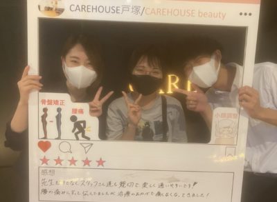 こんにちはCARE HOUSEです。今回撮影にご協力いただいたのはY様です。Y様は姿勢改善でご来院されました。今では、姿勢が段々と良くなって来ています!今後とも姿勢改善頑張っていきましょう!Y様撮影のご協力ありがとうございました。