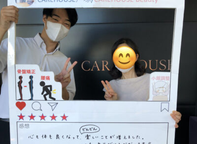 お客様の声第146弾! 2025.07.30 お客様の声お知らせブログ こんにちは!CARE HOUSE戸塚です。今回ご協力いただいたのはT様です。最初はお身体の疲れが辛いという状態でしたが、身体のケアをさせていただき身体の症状がだんだんと軽くなってきました。今後もお仕事の疲れ両方のメンテナンスをしっかりとさせていただ... 続きを読む