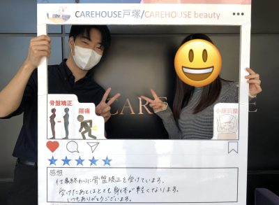 お客様の声第134弾! 2025.02.27 お客様の声お知らせブログ こんにちは。CARE HOUSE戸塚です。今回ご協力いただいたのはO様です!元々姿勢の矯正をメインで行なっていましたが、今では姿勢は改善し、仕事のケアをメインで行なっています。今後もしっかりと身体のメンテナンスを行なっていきます!O様ご協力ありがと... 続きを読む